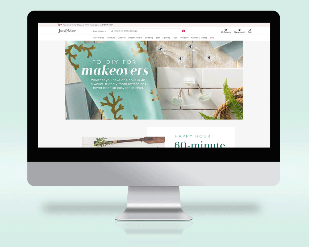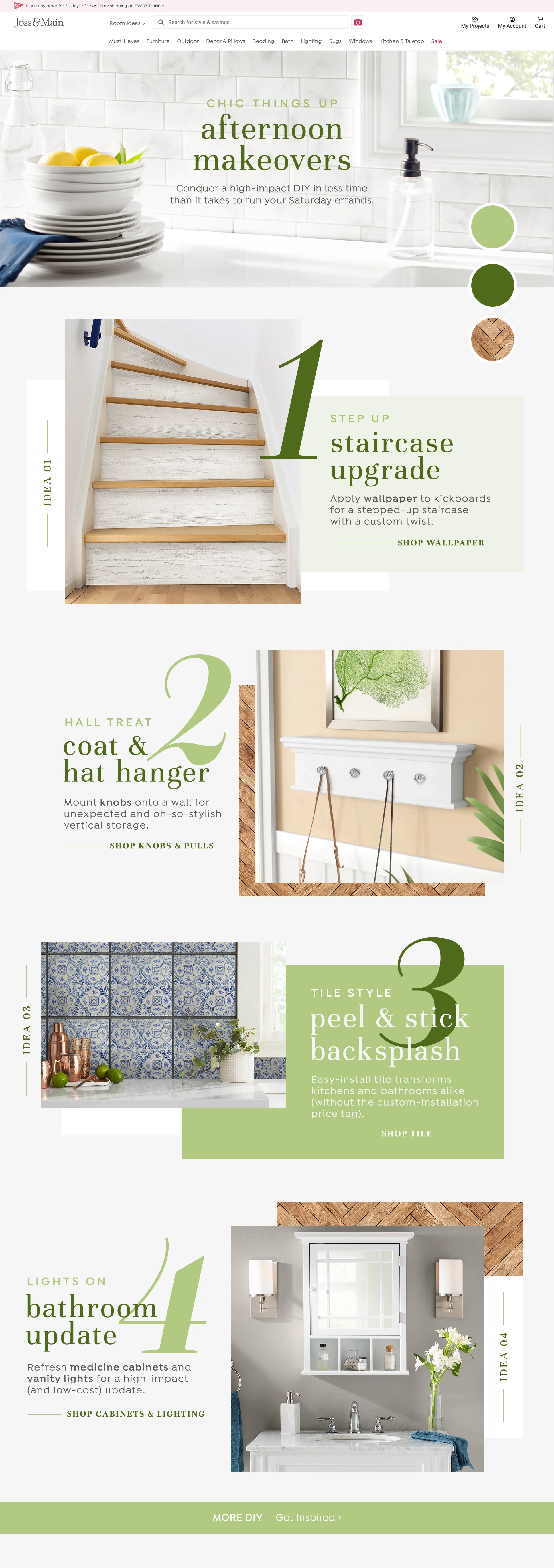 I partnered with Joss & Main buyers to create a DIY hub for customers. The hub spans across four landing pages: projects that take an hour, projects that take an afternoon, projects that stretch over an entire weekend, and a summary page of all projects. I handled everything from concept to design, leveraging color cues and textures for a fresh, clean, and digestible user experience on both desktop and mobile.